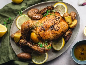 Sirva o frango assado com limão juntamente com as batatas assadas no forno. Decore com rodelas de limão e mais alecrim.